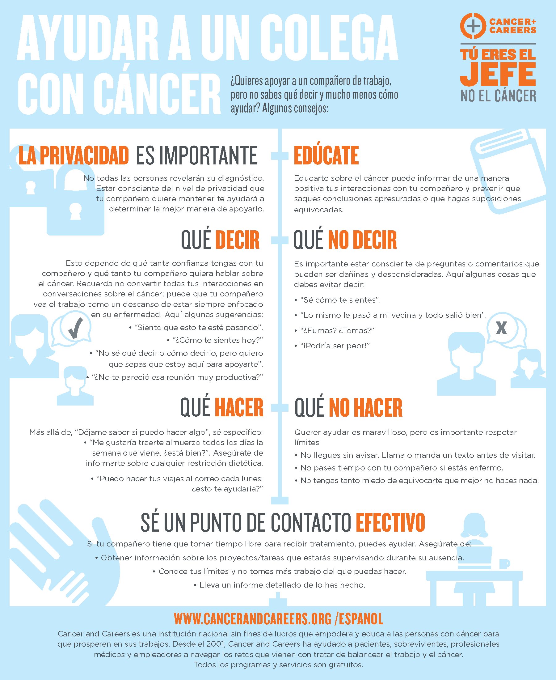 Si a alguien con quien usted trabaja le diagnostican cáncer, tal vez se pregunte: «¿Qué puedo hacer para ayudar?». Nuestra infografía ofrece una ruta visual para ayudarle a identificar las formas de apoyo más efectivas y significativas.